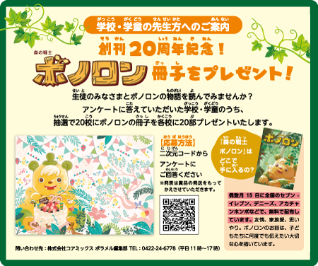 抽選で20校にボノロンの冊子を各校に20部プレゼントいたします。